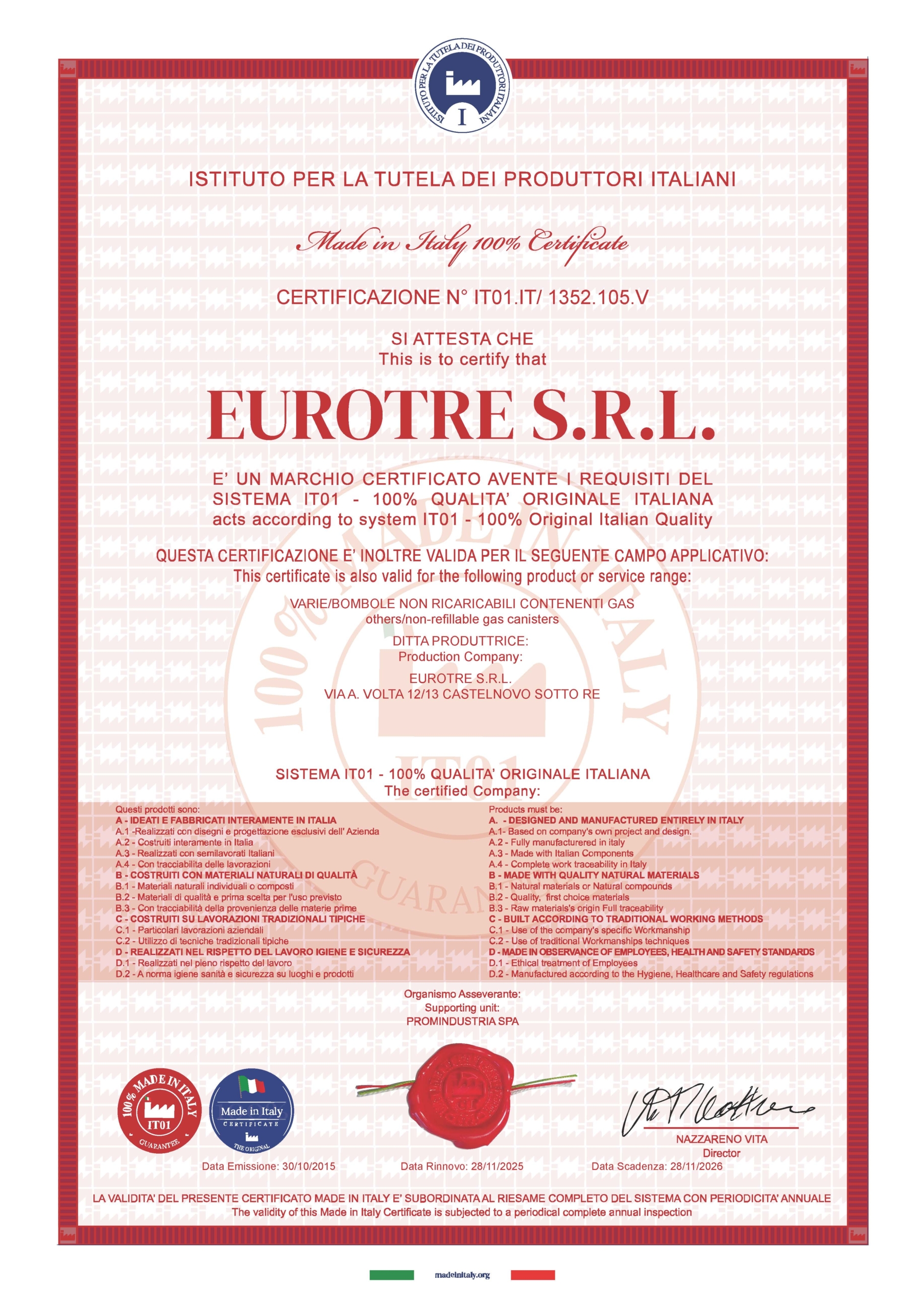 Ciò si traduce in una garanzia di conformità a tutti i requisiti e a tutte le normative, in una sempre più elevata affidabilità dei nostri prodotti e dei nostri servizi e, quindi, in una consolidata soddisfazione dei nostri Clienti.