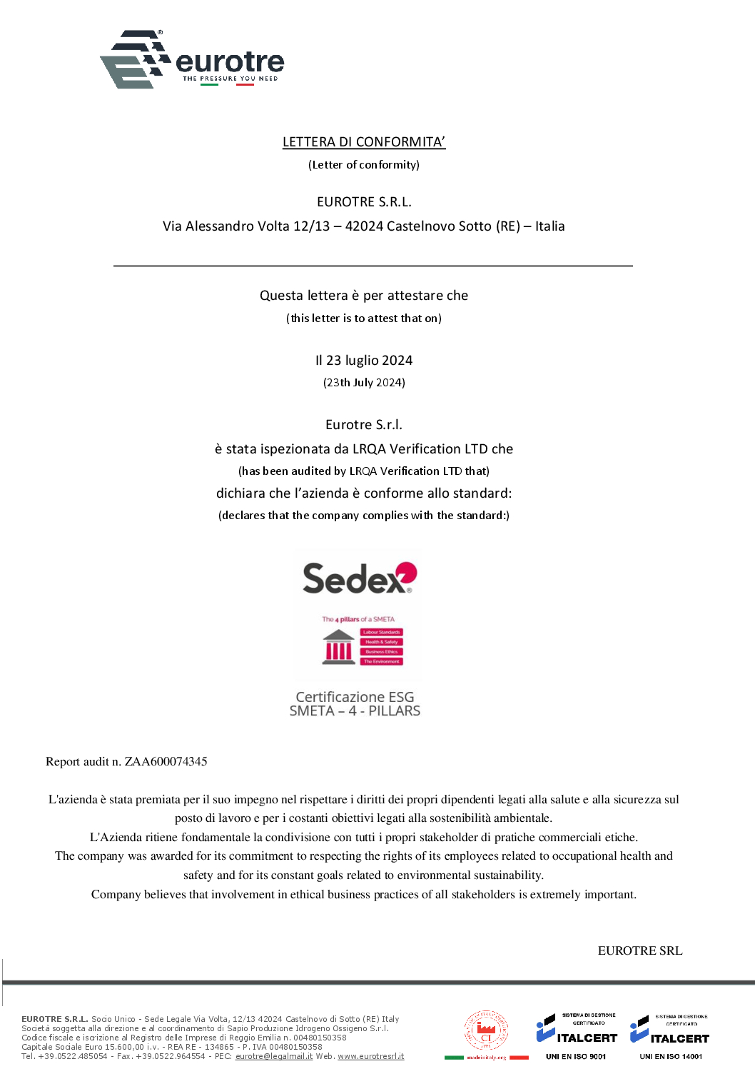 EUROTRE ha progressivamente sviluppato la propria struttura organizzativa e produttiva certificando tutte le fasi principali della propria attività e sottoponendo tutti i processi critici alle verifiche di importanti enti certificatori nazionali e internazionali.
