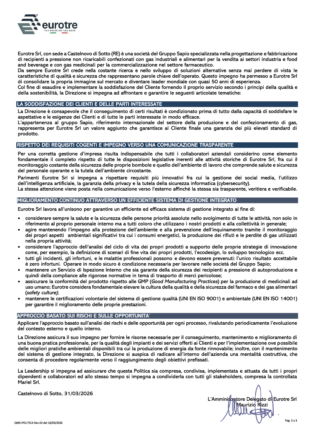 Ciò si traduce in una garanzia di conformità a tutti i requisiti e a tutte le normative, in una sempre più elevata affidabilità dei nostri prodotti e dei nostri servizi e, quindi, in una consolidata soddisfazione dei nostri Clienti.